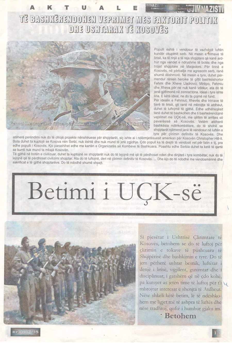 Në shkrimin ku shkruaja edhe për rënien e komandantit të njohur Fehmi Lladrovci dhe bashkëshortes së tij Xhevë Krasniqi-Lladrovci, duke bërë thirrje për bashkimin e udhëheqësve politikë të Kosovës për bashkërendim të veprimeve me UÇK-në, potencoja se: