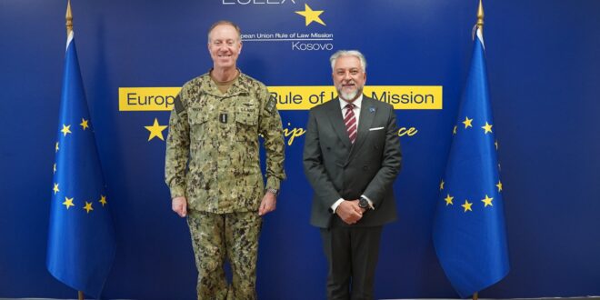 Shefi i Misionit të Bashkimit Evropian për Sundimin e Ligjit në Kosovë, Giovanni Pietro Barbano, ka zhvilluar sot një takim me Komandantin e Komandës së Forcave të Përbashkëta Aleate në Napoli, Admiralin e Marinës së Shteteve të Bashkuara të Amerikës, George M. Wikoff. Në këtë takim, Barbano e priti admiralin Wikoff së bashku me Komandantin e KFOR-it, Gjeneralmajor Özkan Ulutaş, duke theksuar rëndësinë e koordinimit ndërinstitucional në fushën e sigurisë. Sipas njoftimit, diskutimet u përqendruan në bashkëpunimin dhe koordinimin e vazhdueshëm ndërmjet EULEX-it dhe KFOR-it në terren, në kuadër të mekanizmit të reagimit të sigurisë në Kosovë, si dhe në rolin e këtyre misioneve në ruajtjen e stabilitetit dhe rendit publik në vend.