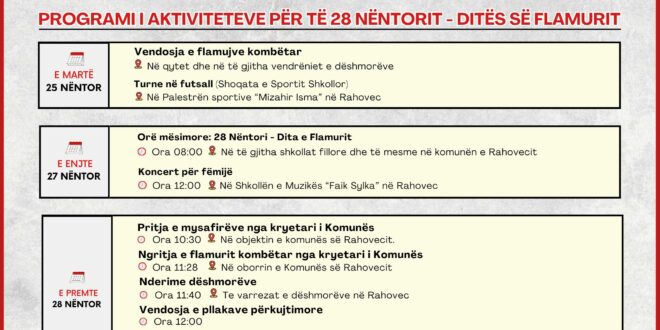 Komuna e Rahovecit ka publikuar ne rrjete sociale agjendën e aktiviteteve zyrtare me rastin e shënimit të 28 Nëntorit – Dita e Flamurit Kombëtar. Këto aktivitete do të mbahen nën përkujdesjen e kryetarit të komunës së Rahovecit, z. Smajl Latifi.