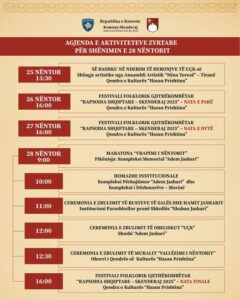Aktivitete nisin me 25 nëntor ne Qendrën e Kulturës “Hasan Prishtina”, në ora 15.30 ku do të jepet shfaqja Artistike nga Ansambli Artistik, “Nëna Terezë”, Tiranë, ndërsa me 28 nëntor në ditën e Flamurit Kombëtar, do të mbahen Homazhe Institucionale në Kompleksin Përkujtimor “Adem Jashari” dhe Kompleksi i Dëmorëve në Morinë.