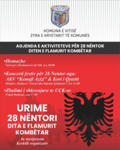 Me rastin e shënimit të Festave të 28 Nëntorit, Komuna e Vitisë, gjegjësishtë zyra e Kryetarit të Komunës së Vitisë ka publikuar agjendë e aktiviteteve që do të mbahen të premtën me 28 Nëntor