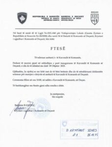Kryetari i Komunës së Malishevës, Ekrem Kastrati, i ka ftuar anëtarët e zgjedhur të Kuvendit të Komunës së Deçanit që të marrin pjesë në mbledhjen e parë inauguruese, që do të mbahet më 9 dhjetor 2025.