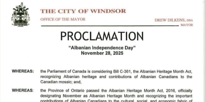 Për herë të parë, në Bashkinë e Windsor-it në Kanada do të ngrihet flamuri shqiptar më 28, 29 dhe 30 nëntor. Institucioni vendor ka njoftuar se gjatë këtyre ditëve ndërtesa e Bashkisë do të ndriçohet me ngjyrat kuqezi, ndërsa data 28 Nëntor është shpallur zyrtarisht si Dita e Pavarësisë së shqiptarëve në këtë qytet. Kjo iniciativë është realizuar me angazhimin e veprimtarëve të komunitetit shqiptar, Arti dhe Jonia Tamburi. Ceremonia e ngritjes së flamurit do të mbahet më 28 nëntor, në orën 15:00, në adresën 350 City Hall Square W. Në aktivitet pritet të marrin pjesë Ambasadori i Shqipërisë në Kanada, Konsulli i Përgjithshëm i Republikës së Kosovës, si dhe përfaqësues të komunitetit. Bashkinë e Windsor-it do ta përfaqësojë këshilltari Angelo Marignani, në emër të Kryebashkiakut Dilkens dhe Këshillit Bashkiak. Organizatorët kanë bërë të ditur se në ceremoni do të marrin pjesë shqiptarë nga të dyja anët e kufirit, duke e vlerësuar këtë si një ngjarje të rëndësishme për komunitetin në Windsor.