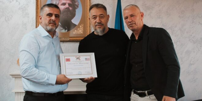 Mirënjohjen, kryetarit Lushtaku ia dorëzuan bashkëluftëtarët Astrit Huskaj – kryetar i OVL të UÇK-së në Amerikë dhe Naser Morina – Bardheci.